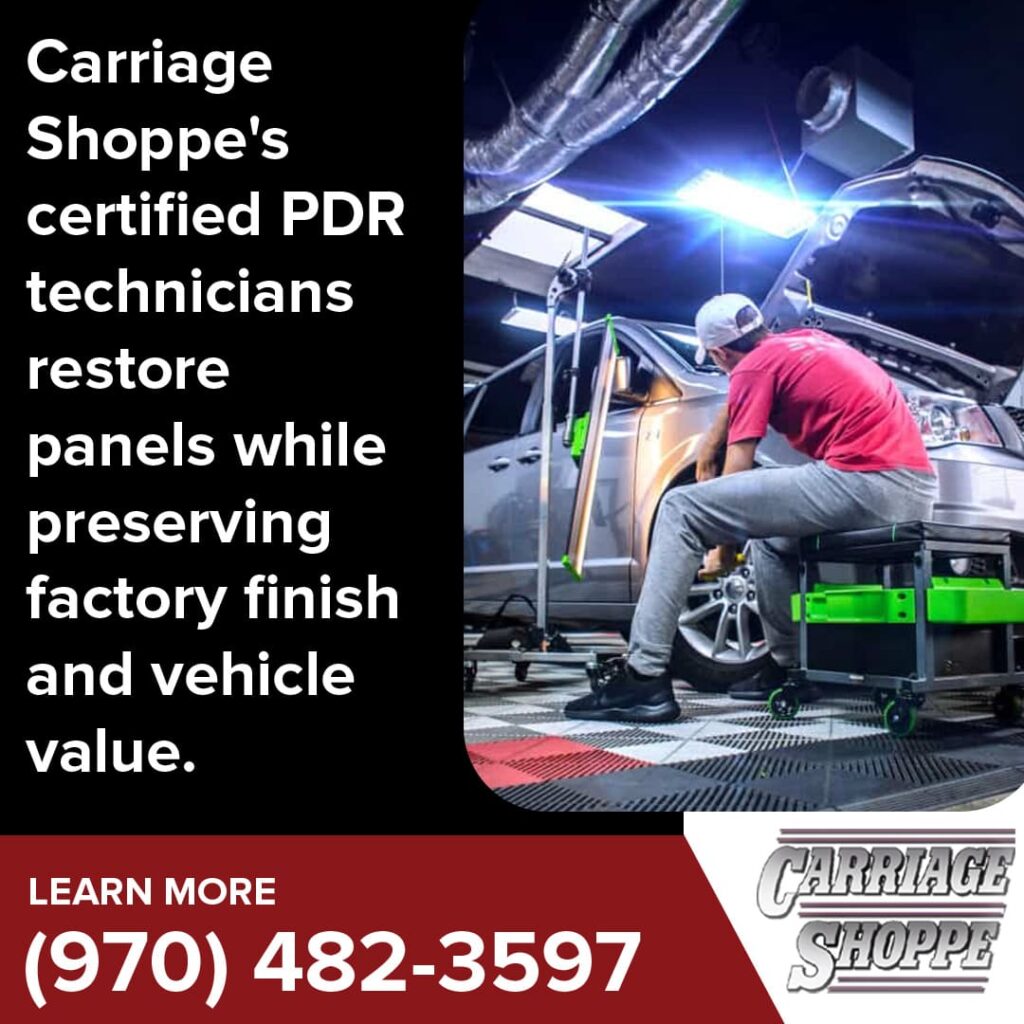 Contact Carriage Shoppe to schedule your paintless dent repair and bring your vehicle back to its original condition. Our certified PDR technicians remove dents carefully, maintain your factory paint, and restore smooth surfaces quickly. Call us at (970) 482-3597 or email officestaff@carriageshoppe.com to set up your appointment. You can also visit our website to learn more about our services and request a free estimate.